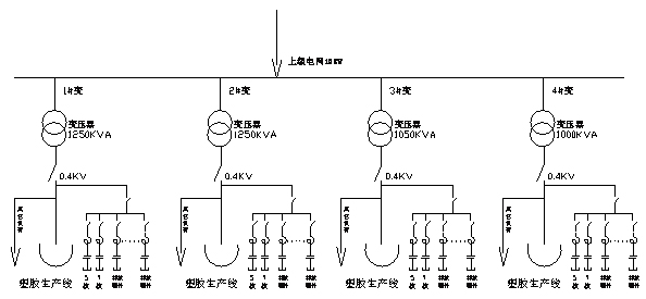 公司由一路10KV進(jìn)線,廠內(nèi)安裝1250KVA整流變壓器2臺,1000KVA整流變壓器2臺,均為10KV/0.4KV。4臺整流變壓器分別帶4條塑膠生產(chǎn)線,如下圖: